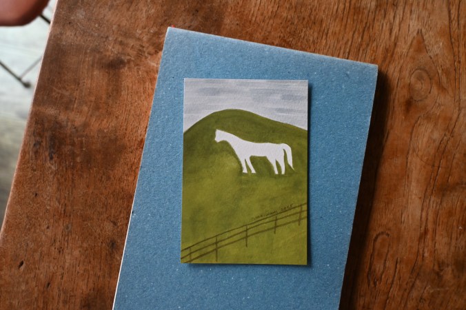 葉書が掛け替えができる葉書掛けに入っている作品は 額装用マット付き、フレーム入りも承ります。