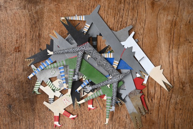 岩絵具、墨、印刷物、刺繍糸、古布など使い