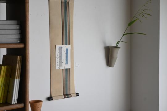 今回は川原さんの絵を掛軸、ワイヤーのホルダーで壁に掛け