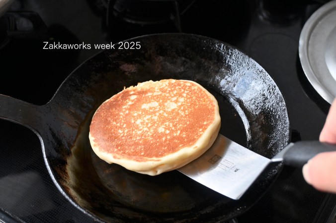 会期中、タークのフライパンで米粉パンケーキを焼きます。
